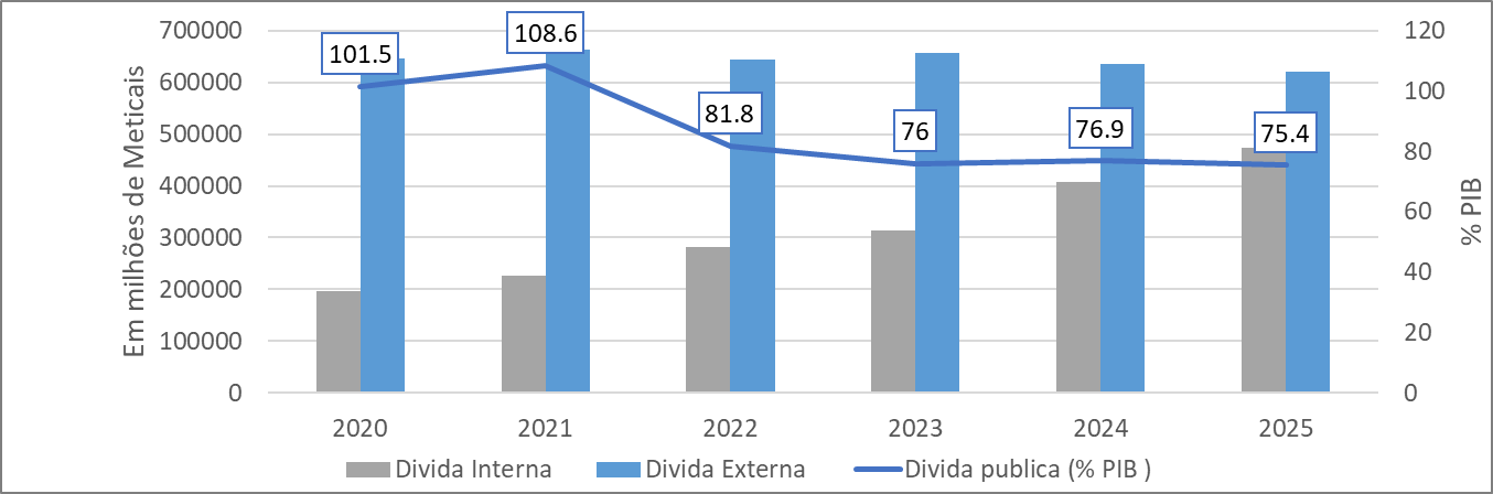 Após atingir níveis elevados, o rácio dívida pública sobre o PIB começou a recuar gradualmente na sequência da reestruturação parcial da dívida externa, da consolidação fiscal e da retoma do crescimento económico. Ainda assim, o nível permanece elevado e classificado como de alto risco de sobre-endividamento. O stock da dívida pública atingiu cerca de 101,5% PIB em 2020. Em 2022 reduziu para aproximadamente 81,8% do PIB. Em 2023 e 2025 situou-se na faixa de 75 a 77% do PIB. Apesar desta trajetória descendente, Moçambique permanece entre as economias africanas com maior nível de endividamento relativo (FMI, 2024).