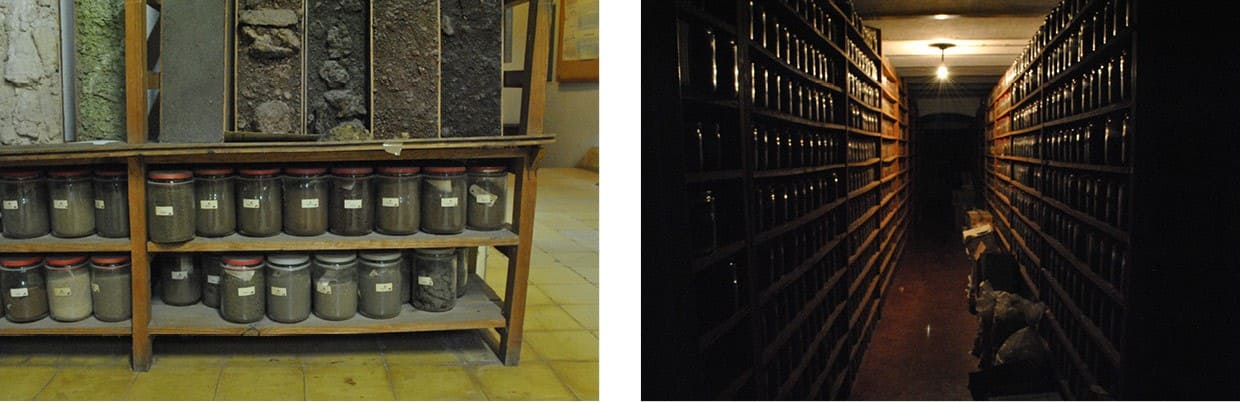 Vista interior de dois espaços da Pedoteca, preenchidos com amostras de solo. Agosto 2016.