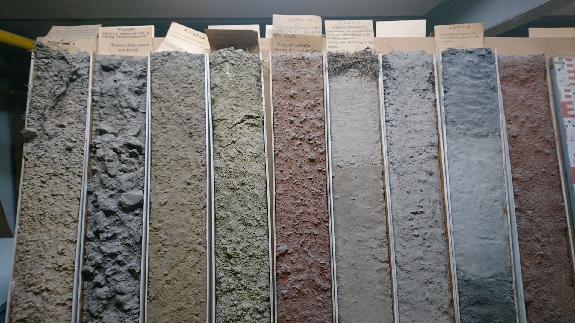 Coleção de monólitos de solo extraídos de Angola entre 1946-74, em exibição na Pedoteca. Agosto 2016.