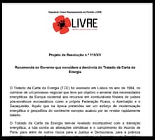 15 junho 2022 Apelo à saída de Portugal do TCE na AR, um projeto de resolução apresentado pelo LIVRE, que se juntou aos esforços que a sociedade civil para travar este tratado tóxico.