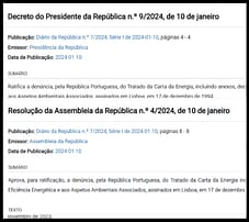 10 janeiro 2024 a) A AR aprova, para ratificação, a denúncia, pela República Portuguesa, do TCE incluindo anexos, decisões e Ata final, e o Protocolo da Carta da Energia Relativo à Eficiência Energética e aos Aspetos Ambientais. b) O Presidente da República ratifica a denúncia, do TCE por Portugal.